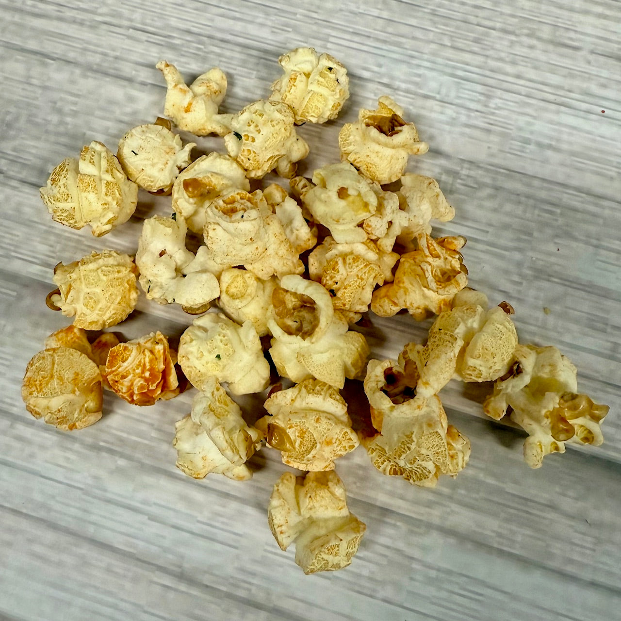 A MIXTURE OF COOL RANCH FLAVORED POPCORN AND HOT BUFFALO SEASONED POPCORN.